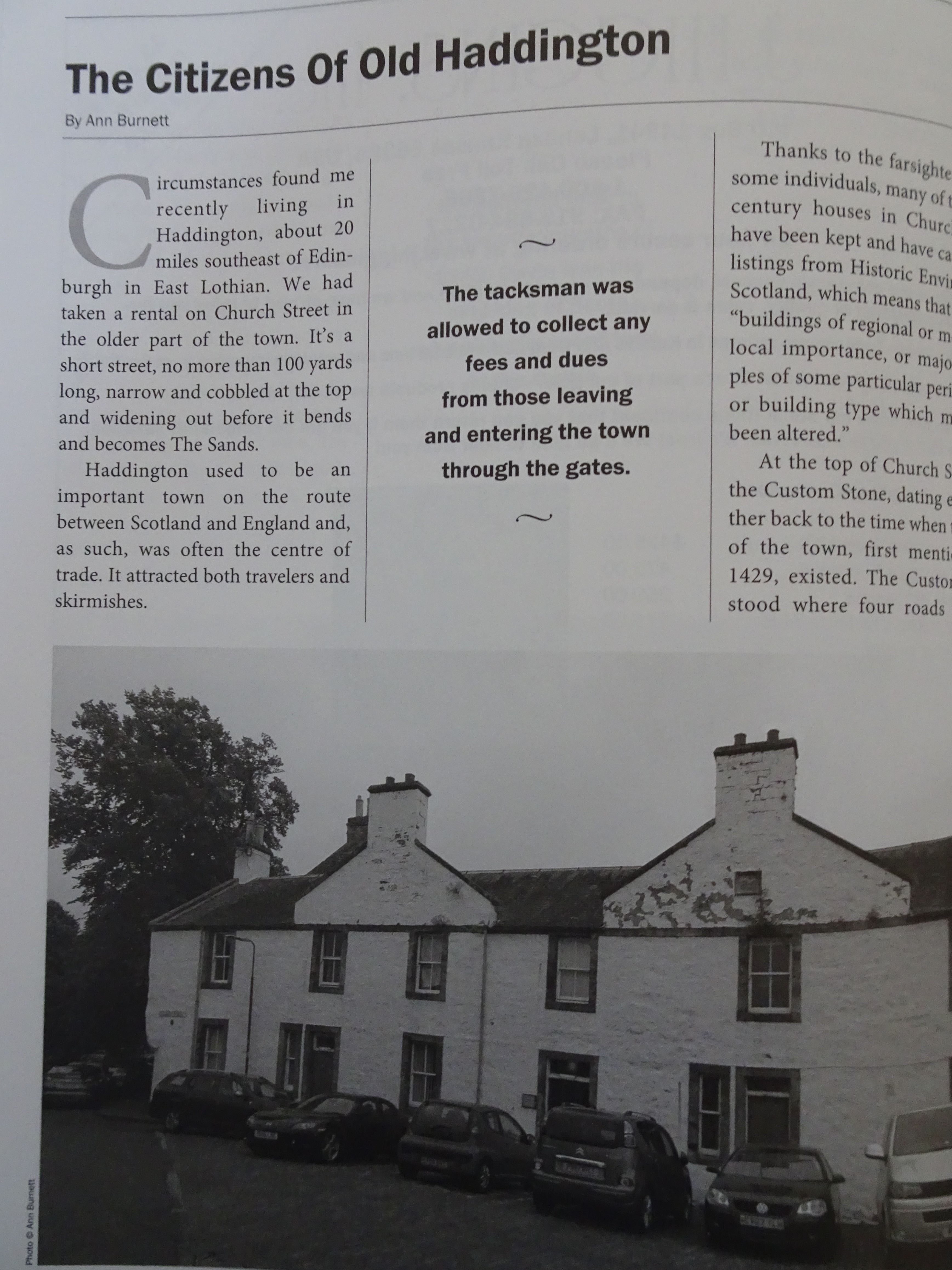 So far this year, they have published two of mine, both on the town of Haddington; one about Bruce’s Charter which he gave to the town in 1318 and which is kept in the John Gray Centre in the town, and another on the street where we lived temporarily while waiting for our new home to be ready. There aren’t many streets that can claim to have a Custom Stone at one end and the site of a battle at the other with John Knox’s school in the middle for good measure!